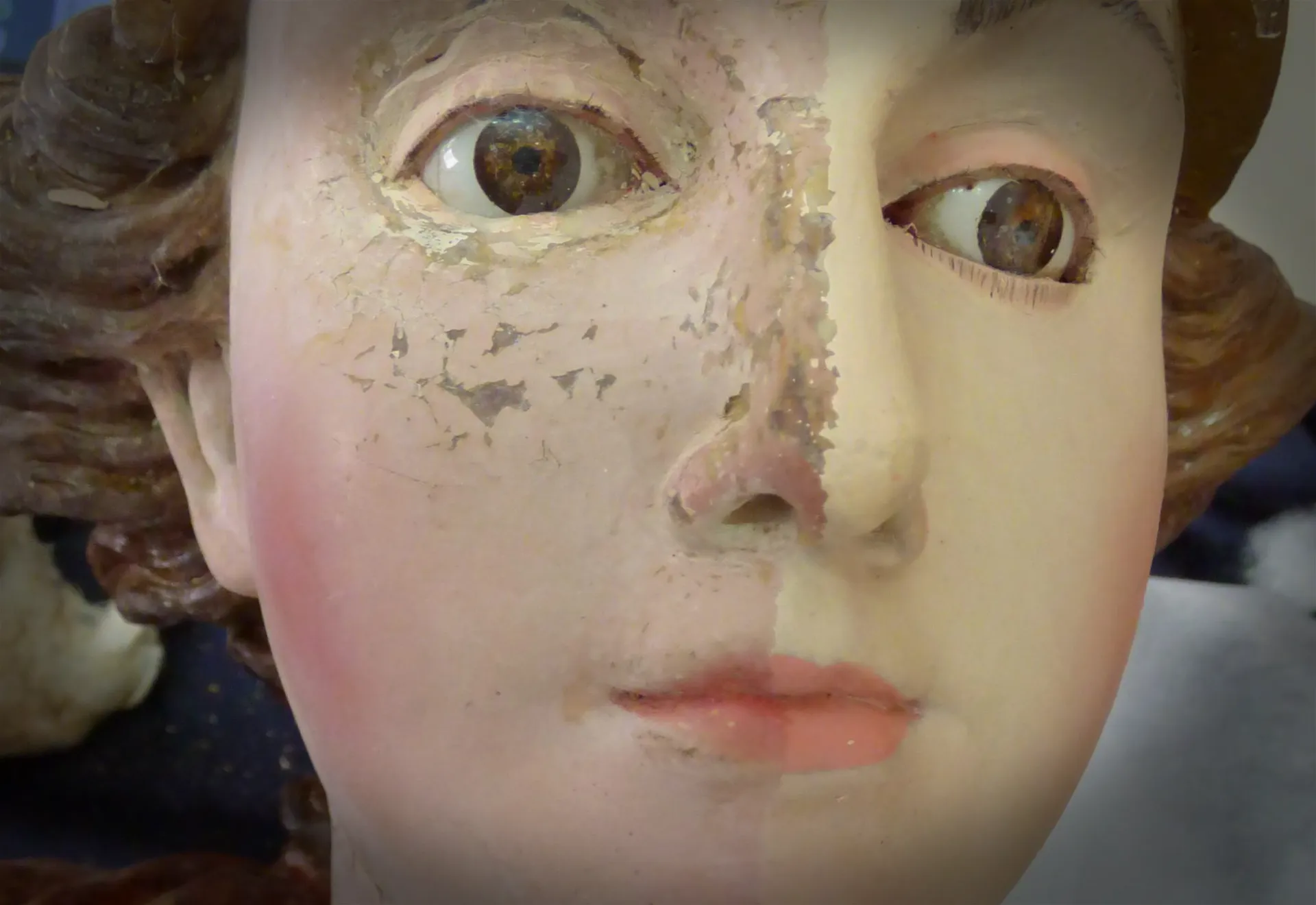 Restauración de escultura policromada en madera, con especial atención a alteraciones derivadas de movimientos estructurales, pérdidas de policromía y acumulación de depósitos superficiales.